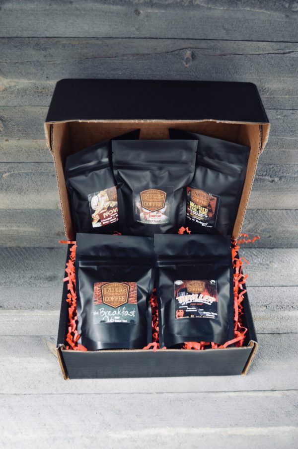 Indies Coffee presents Fresh Force Five, a gift box with a great ensemble. Each Fractional Package of coffee is fresh roasted, organic, fair trade, and kosher, placed in a box with an Indies Coffee $25 Gift Card. This way the receiver of this fine gift will be able to see which one they like and then use the gift card toward a purchase or subscription. The coffee ensemble will include: